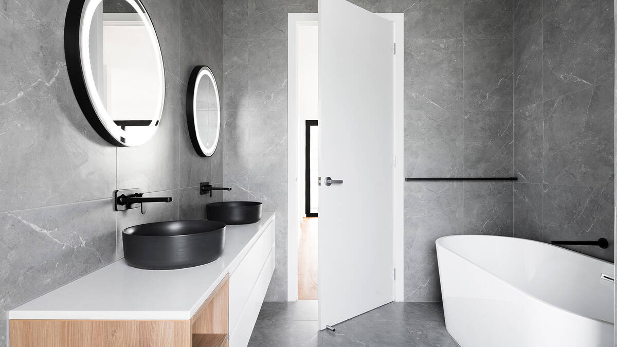 رنگ های خاکستری مرمریت این حمام، کاملاً با عناصر سیاه و سفید مطابقت دارند و در عین مینیمال و ساده بودن، بسیار زیبا و دلنشین است.